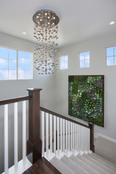 This client employed our Interior Design team to modernize their spacious Irvine home. This goal was achieved through key placement of contemporary accessories and fixtures, including a bubble chandelier and living wall – a wall hanging made of real, living succulents- above the staircase. The dining room has an almost futuristic style, with a silver wallpapered ceiling, and matching dining chairs. This room is pulled together beautifully with a dark wood table, and floor-to-ceiling chocolate brown curtains. Each of these three bedrooms has a different individual theme, but are still tied into the rest of the home with defined lines and a modern feel.The master bedroom has a regal atmosphere, with a diamond tufted headboard against a patterned wall paper, with a large reading nook to the side of the room – while the guest bedrooms have a lighter feeling, one with a blue area rug & curtains, and the other with large accents of aqua and grass green. The final touch on this project is a family room that doubles as a home office, a beautiful fusion of fashion and function.